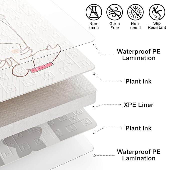 - Safe and Comfortable: Made of high-density, scratch resistant XPE foam material, BPA free and non-toxic, provides ample space for babies to crawl, walk and play. 0.4 inch thick mat provides cushioning protection, protect infants from serious falls and floor collisions