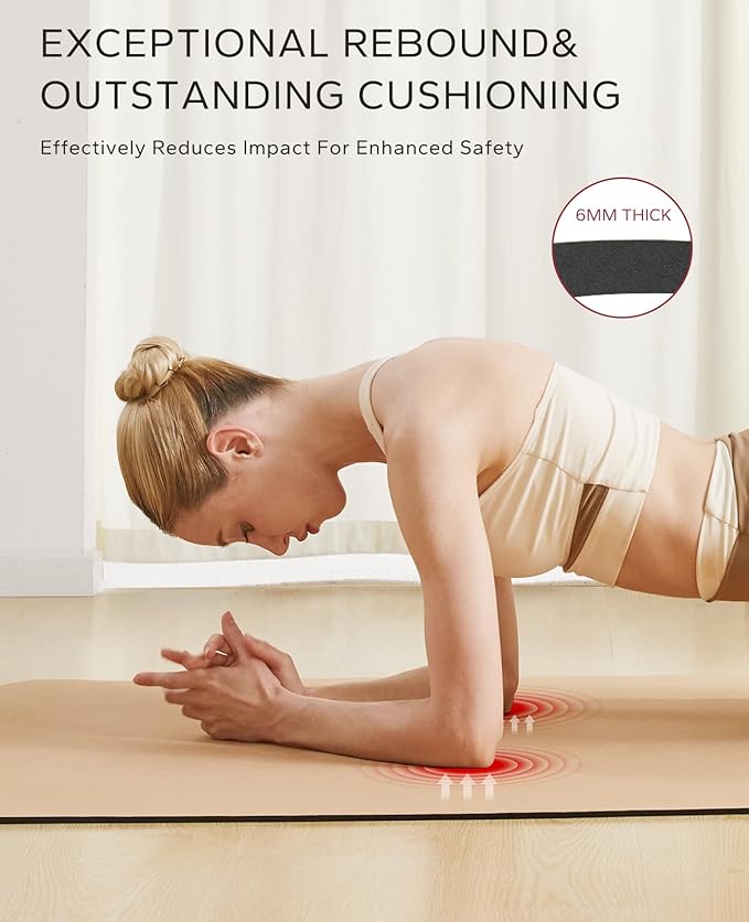 - 6mm Thick for Joint Support:This thick yoga mat’s 6mm design cushions joints during yoga, Pilates, and home workouts. The dual-layer structure absorbs impact, reducing pressure on knees, wrists, and elbows for comfortable, long-lasting sessions—perfect for the supportive cushioning your practice needs