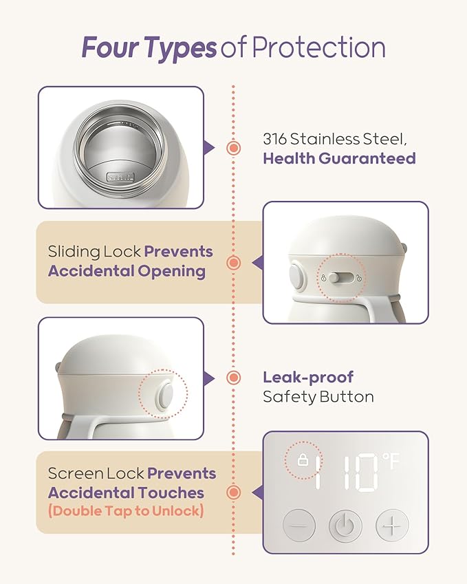 - Leak-Proof and Baby-Safe Design: This baby brew bottle warmer is designed with a secure, leak-proof lid and a child safety lock, preventing spills and misuse while providing peace of mind for parents.