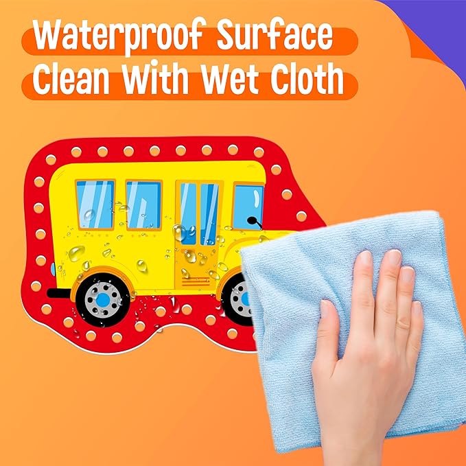 - Bright-colored & Eye-catching: The pattern covers different vehicles, like a submarine, a plane, a train, a helicopter, a car, a rocket, and more. The patterns on the cards are colorful, vivid, and vibrant. The pre-punched holes are easy for preschoolers to work with. The strings are easy for children to use and fit into the holes easily.