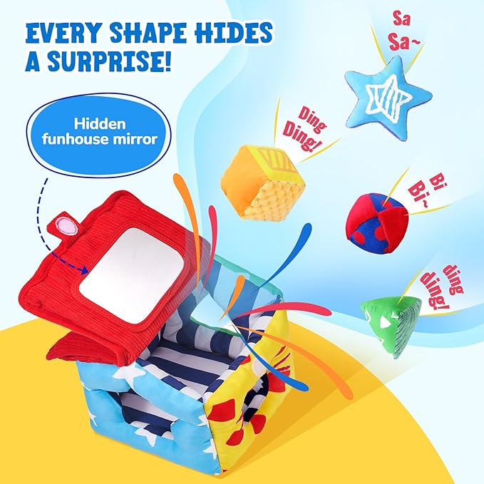 - All-in-1 Sensory Sorter: This soft fabric house includes 4 plush shapes, each with unique textures, sounds, and crinkles to stimulate touch, hearing, and curiosity. The Hide-and-seek roof hides a baby-safe mirror for self-discovery!