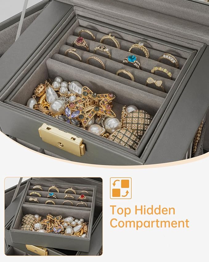 AKOZLIN 4-Tier Jewelry Box Leather Jewelry Storage Organizer with 3 Drawers Lockable for Women Girls Ring Necklace Earring Bracelet Holder with Mirror Dark Grey