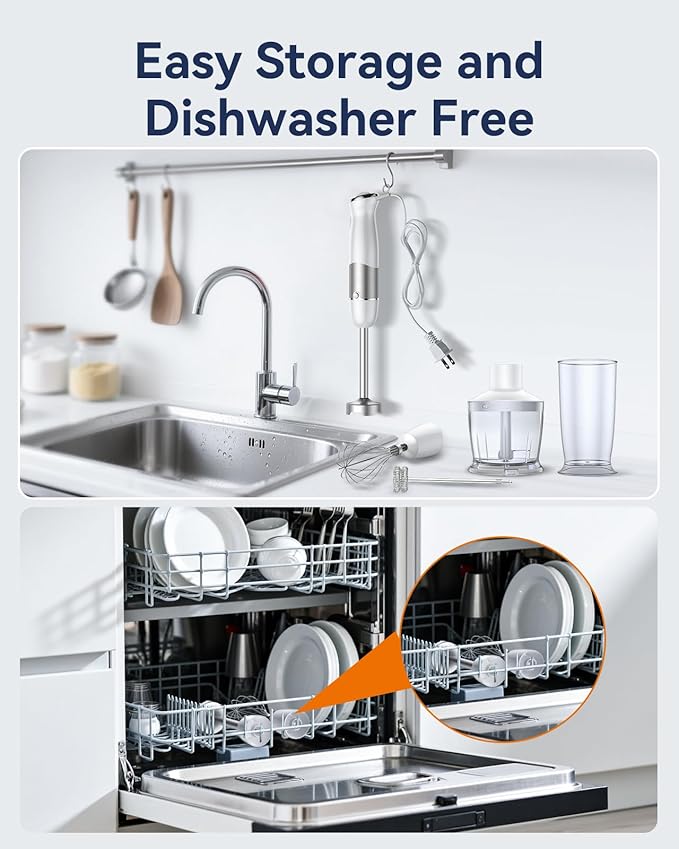- Easy to Clean: The snap-on/off detachable attachment design makes this emulsifier blender easy to connect and disconnect and a breeze to clean as they all comes off easily than a regular blender. You can just rinse it off after use or wash it in dishwasher. It can hang with the hook and the main body can easily be cleaned by wiping with a soft damp cloth. (except blender shaft and chopping bowl lid requires hand wash and the water temperature of the dishwasher should be below 75°).