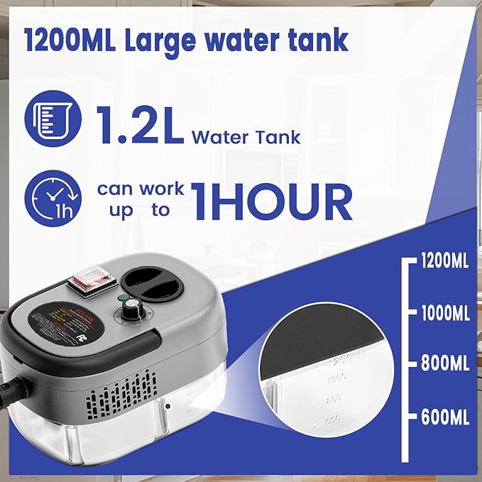 - 【1200ml Water Tank & Portable】The home portable cleaning machine is equipped with a 1.2 large water tank, allowing you to focus on cleaning, not only supporting adding water at work, but also using water for 1 hour at a time, even if it is far away from the water source, it can extend the cleaning time without adding water frequently, providing work efficiency. In addition, the washer's compact design weighs only 3.8 pounds, making it easy to carry with you for cleaning.