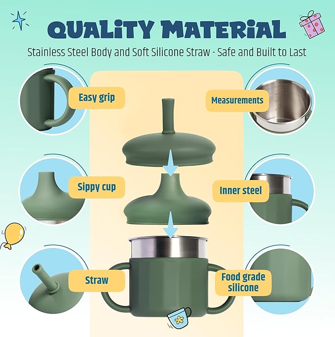 - Eco-Friendly Choice –Unlike traditional plastic cups, this 8 ounce stainless steel toddler and kids cup reduces waste and lasts longer. It's the perfect alternative for parents seeking baby sippy cups with lids for 12 months that are both durable and environmentally friendly.