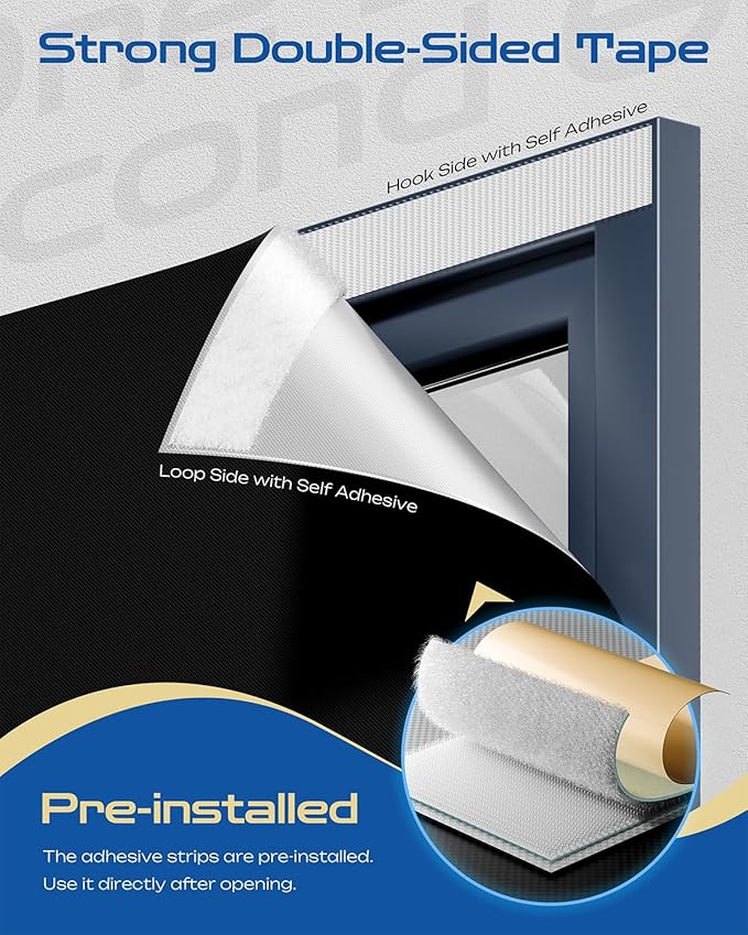 - Upgraded Hook & Loop Installation - Featuring industrial-grade Hook & Loop tape, no drilling or professional tools are needed. Simply fix the patches on the window frame (suitable for both flat and curved surfaces), align the window curtains, and press to complete the installation in just a few minutes. For creases, iron at 120℃–150℃ with a cloth to maintain the durability of the fabric and fastener