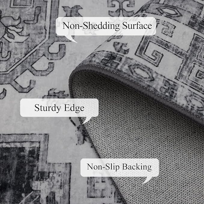 4x6 Washable Area Rug for Living Room, Carpet for Bedroom, Soft Faux Wool Retro Dining Room Rug, Non Slip&Non-Shedding Resistant Low Pile Vintage Print Rug for Home Office (Medium Gray)