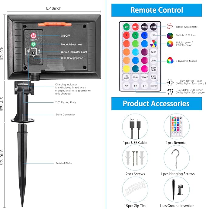 - Large Solar Panel & USB Rechargeable: Built-in a 2400mAh battery and a large-size solar panel, the RGB outdoor rope lights can work up to 10-12 hours when fully charged. Besides, the panel is equipped with a USB charging port to charge the solar panel when in bad weather. Charging time: 8 hours of direct sunlight or 5 hours via USB. The 120°adjustable design of the solar panel allows you to position the panel for direct sunlight. Search ASIN: "B0CZLQP6WN" for rope lights clips