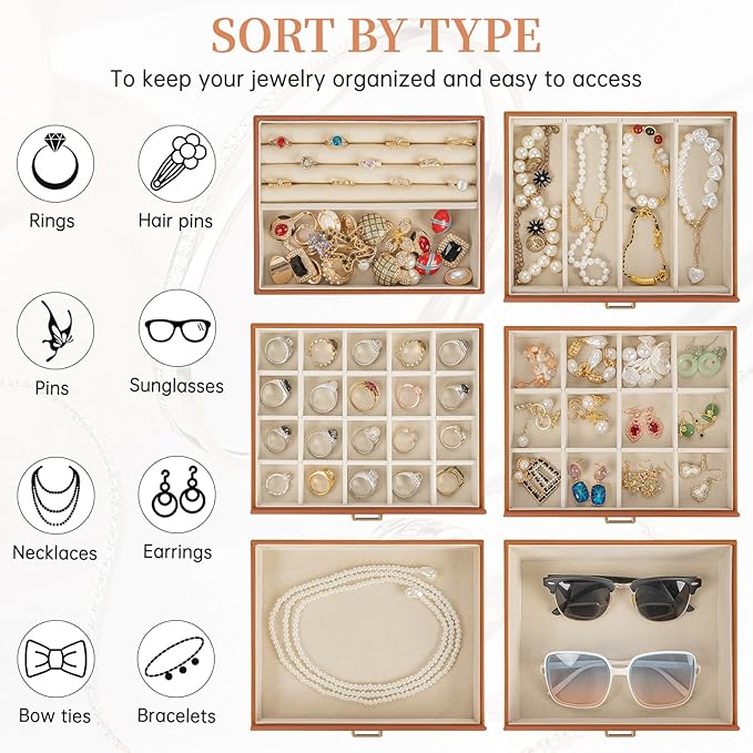 - LARGE CAPACITY:With 6 versatile pull out drawers, this huge jewelry box can store a lot of jewelry accessories, such as rings, earrings, necklaces, chains, bracelets, and so on. One deeper drawer is designed for sunglasses or large jewelries.