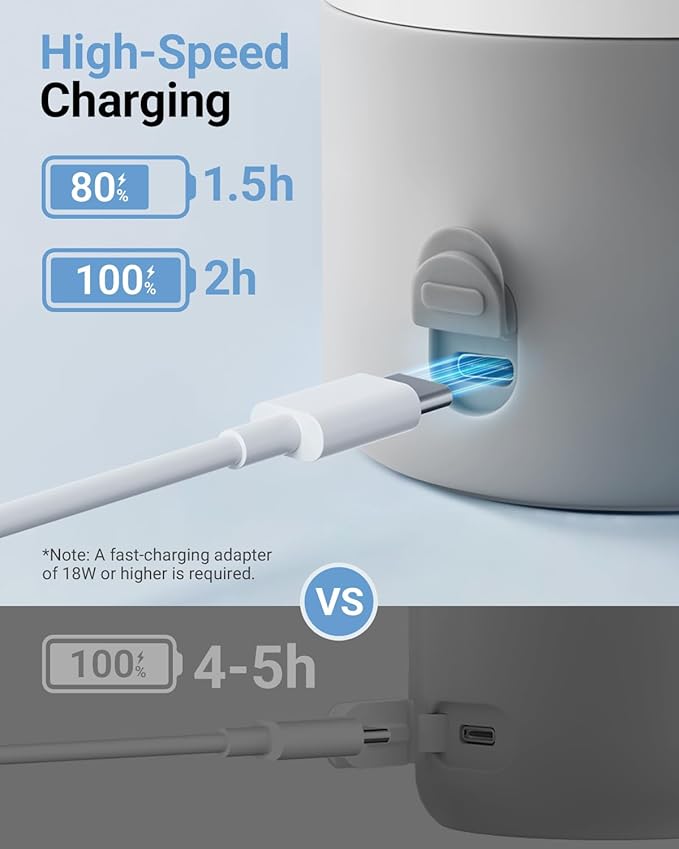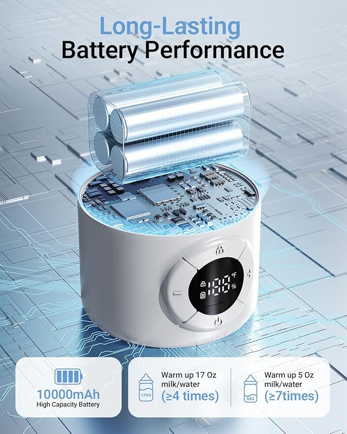 - ๐ ๐๐ฌ๐ญ ๐๐ก๐๐ซ๐ ๐ข๐ง๐ & ๐๐จ๐ง๐ -๐๐๐ฌ๐ญ๐ข๐ง๐ ๐๐๐ญ๐ญ๐๐ซ๐ฒ: Equipped with a 10000mAh battery, this USB-C fast charging bottle warmer can warm up to 7 bottles (5oz each) on a full charge. Get an 80% charge in just 1.5 hours with a fast-charging adapter of 18W or higher, ensuring all-day power for your travel needs. โ ๏ธ๐๐ฆ๐ฉ๐จ๐ซ๐ญ๐๐ง๐ญ ๐๐จ๐ญ๐: It's not recommended to use the bottle warmer while charging to avoid low heating efficiency