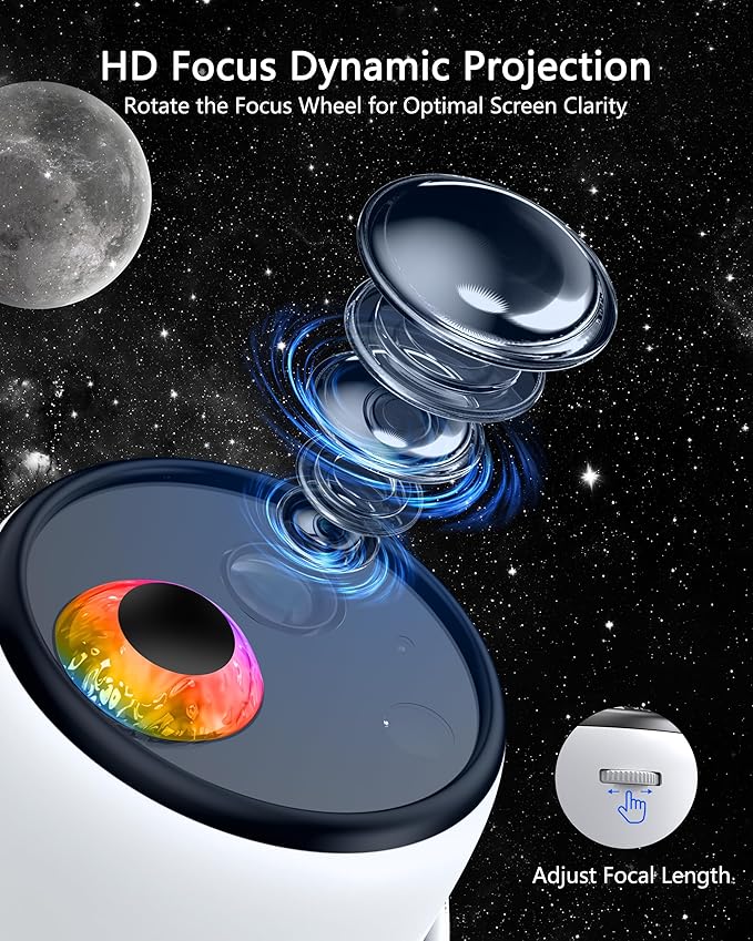 - Flexible Projection & Focus: Equipped with a high-definition lens, our galaxy night light projector delivers sharp images within 3–5 meters. Adjust the 180° angle and focus wheel to display dynamic scenes on ceilings, walls—creating a personal planetarium in seconds