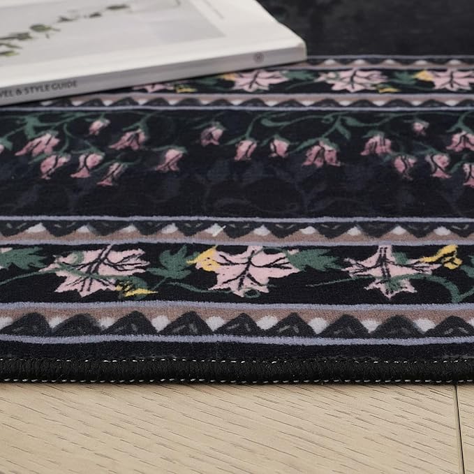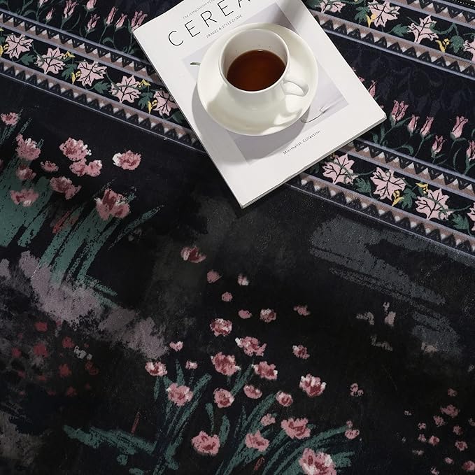 5x7 Area Rugs Impressionist-Style Vintage Washable Area Rug Non Slip Low Pile Large Rugs for Living Room Bedroom Farmhouse Dining Room Kids Playroom, Black