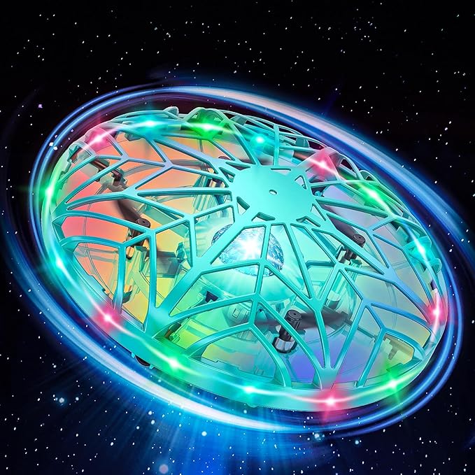- 360° Rotating Flight Design: Fly this mini UFO drone toy with your hands! Place both hands on both sides of the drone, swipe a hand under when the lights start to blink rapidly, and watch this LED drone perform a 360° flip